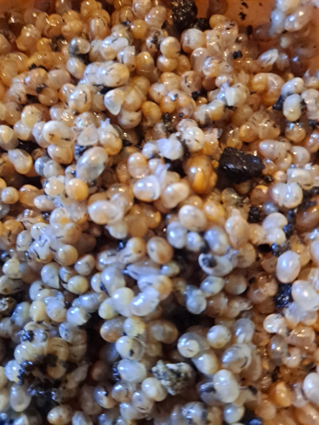 Un Escargot Gros Gris pond entre 60 à 100 Œufs, un œuf pèse environ 3 Grammes