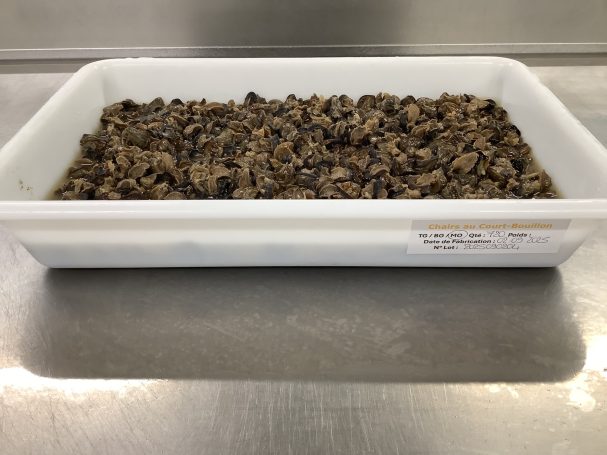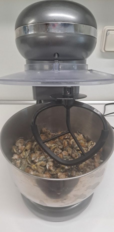 Une fois décoquillées, les chairs conservées sont passées au batteur à vitesse lente afin d’évacuer le mucus (bave). Après 5 à 6 minutes, les chairs sont rincées à l’eau claire puis remises au batteur. Cette opération se fait autant de fois qu’il reste du mucus
