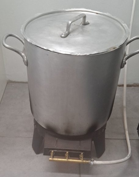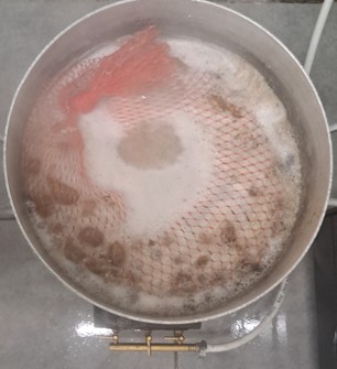 Les coquilles sont plongées dans l’eau bouillante, cette étape a pour but d’éliminer une dernière fois toutes les traces de soude et de chlore, et facilite le séchage.