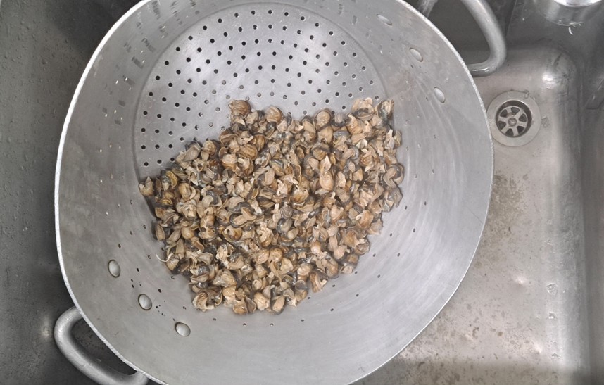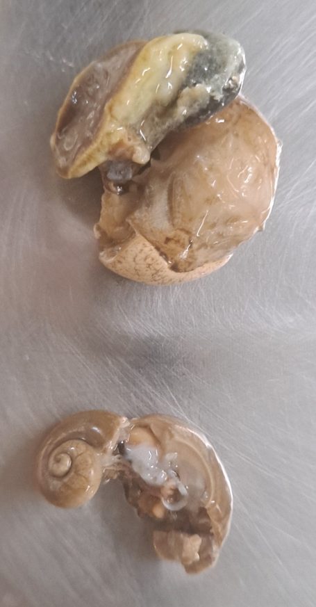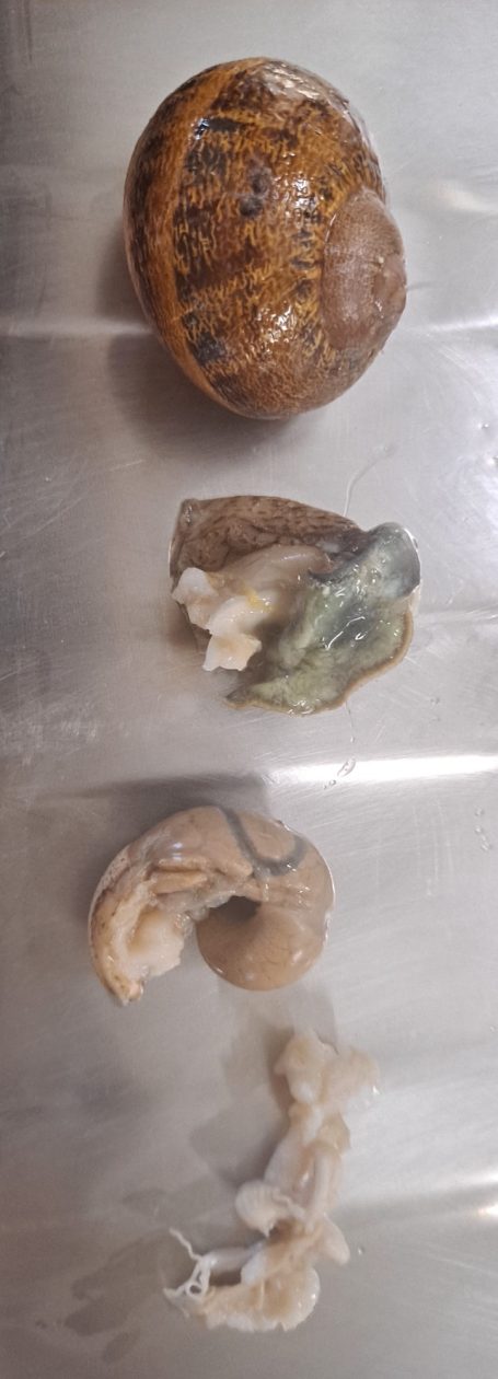 Une fois ébouillanté, chaque Escargot est vidé de son Hépatopancréas qui correspond à ses organes (Foie, Poumons, Cœur….) ainsi que de ses organes reproducteurs. Les plus belles coquilles sont gardées pour la suite de la transformation.