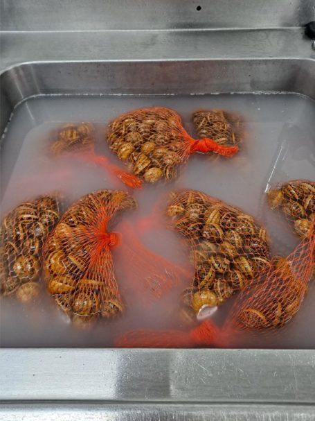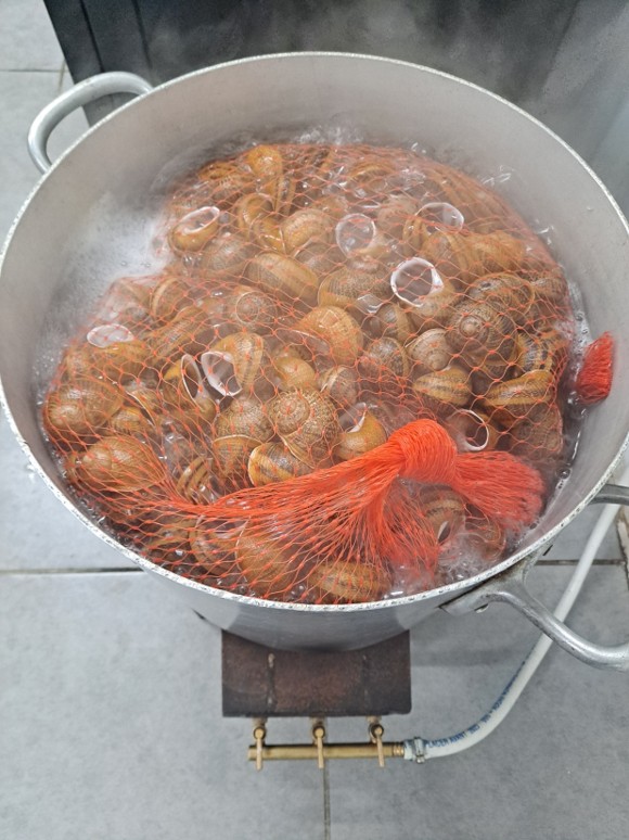 Contrairement à ce que tout le monde pense, on ne fait pas dégorger les Escargots dans le gros sel, cela étant considéré comme de la maltraitance animale. Les Escargots endormis par le séchage et le froid sont plongés dans l’eau bouillante pendant 10 minutes.